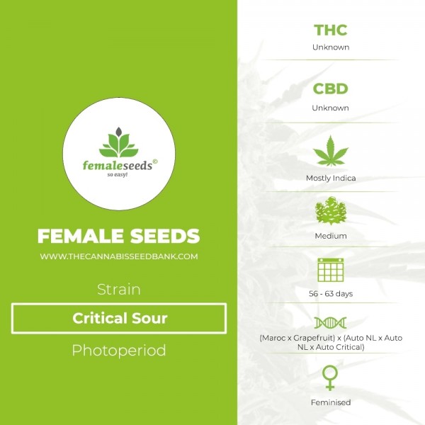 Critical Sour Feminized Cannabis Seeds were created by female seeds, with the aim to produce an early maturing strain that can be cultivated outdoors. Critical Sour was developed by crossing a Maroc x Grapefruit mother, with Auto NL x Auto NL x Auto Critical father.