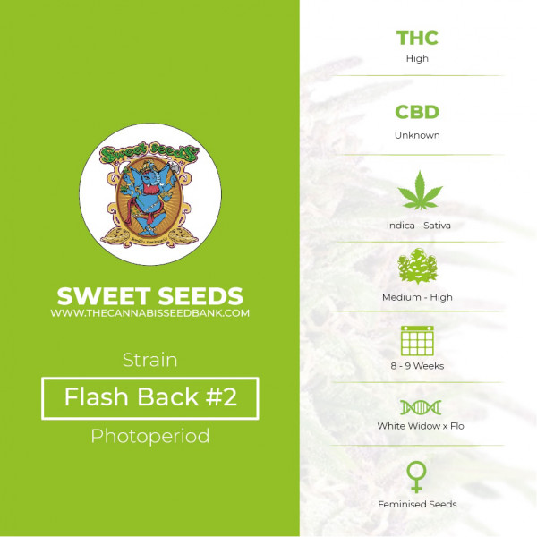Flash Back #2 Feminized Seeds is a beautifully blended Indica / Sativa marijuana strain that was the result of combining the world-famous White Widow with the potent Flo strain. Growing into a fairly tall plant, Flash Back #2 gives you a more than satisfying yield of up to 700g/pp when cultivated in an outdoor environment. Flash Back #2 takes only 8-9 weeks to fully mature, and her harvesting period is in late September before the cool winter months in the Northern Hemisphere. Her absolutely striking lime green buds are highly resinous and enough to make anyone crawling back for more! Her flavours include that of fresh fruits and strawberries that will give you that proper summer feel that you won't ever want to end, luckily you'll have more than your fill of her to carry you over the next couple of months, giving you flashbacks of summers past – depending on what type of monster smoker you are of course! Her effects are that of a lovely but strong cerebral high that gradually guides you to more of a relaxed state. We would highly recommend toking Flash Back #2 during the day with some friends, chilling out in the sun on a warm summers day.